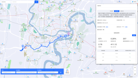 基于高精度地图和公交底层数据建设重庆公交数字运营中心,完成站点客流分析、班次分析、热力图、线网覆盖率、线路效益分析、公轨接驳客流人次等分析功能。依托重庆公交数字运营中心进行精细化客流分析,以供需平衡为导向,主动优化调整线网及运营组织方案,实现“客流、运力、路况”资源匹配的智能排班。基于区域化运营理念,对多线路多班次进行混合调度,实现广域不均衡出行需求的动态精准匹配和区域人车资源统筹优化。